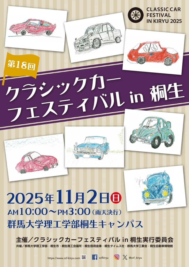 桐生商工会議所は11月2日、群馬大学理工学部桐生キャンパス(群馬県桐生市天神町)を会場に旧車ミーティング「第18回クラシックカーフェスティバルin桐生」(主催=実行委員会)を開催する。