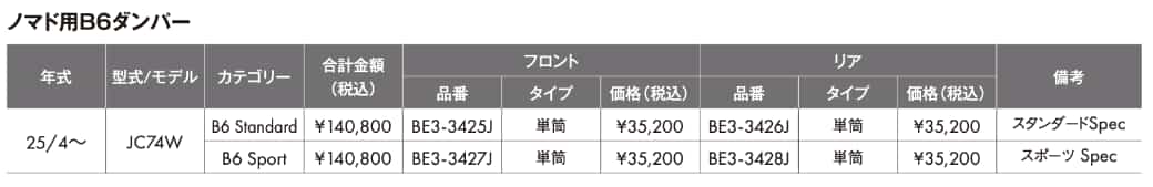 「B6 Standard」は、Jimny SIERRAと比較してロングホイールベース化、車両重量が増えたJimny NOMADEに合わせて開発され、スタンダードセッティングという位置づけになる。