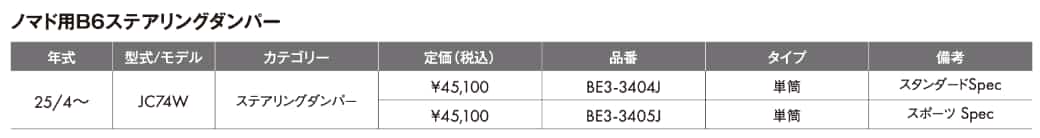 製品ラインナップはスタンダード、スポーツの2種類が用意されており、純正形状スポーツダンパーの価格は共に1台分140,800円(税込)。ステアリングダンパーが共に1台分45,100円(税込)。