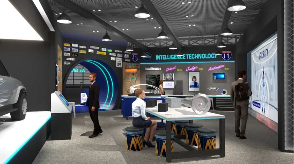 電動化、知能化に関する製品などアイシンならではの幅広い製品をガレージに見立てて展示。クルマを所有する喜び、走る楽しさに満ちた空間を演出する。