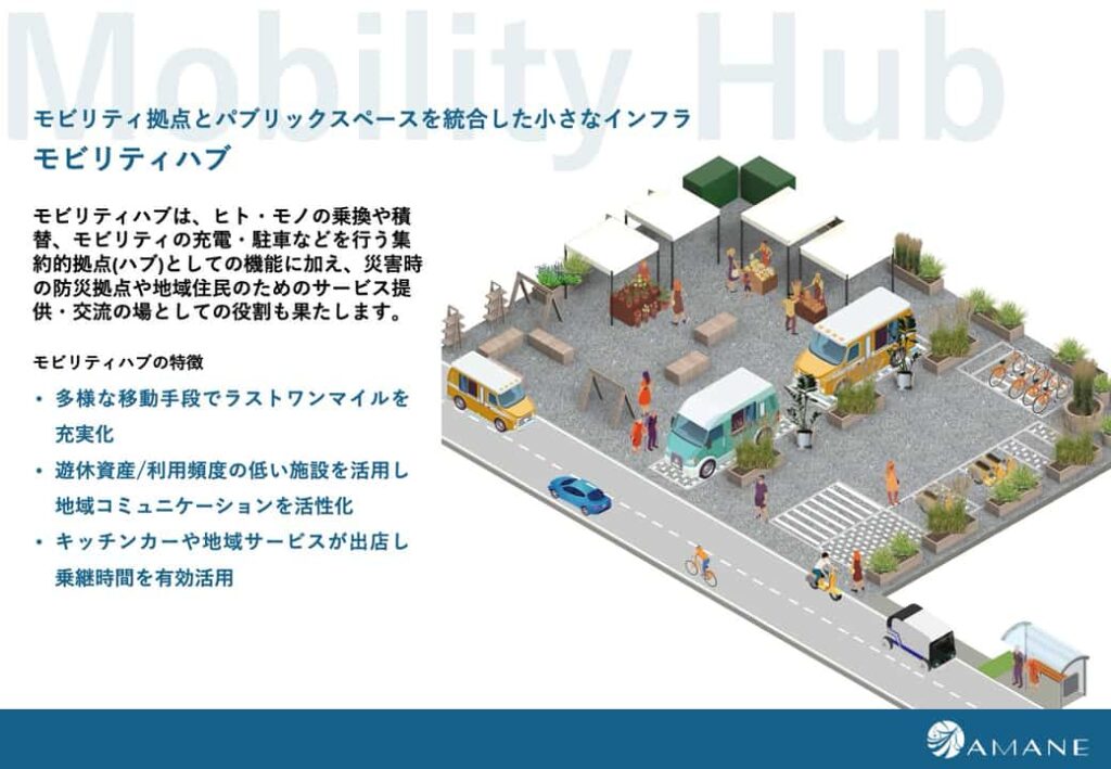 ヒト・モノの乗換や積替、モビリティの充電・駐車などを行う集約的拠点(ハブ)としての機能に加え、災害時の防災拠点や、地域住民のためのサービス提供・交流の場としても機能する。同社ではモビリティハブの自社運営に加え、企業・自治体のモビリティハブ構築を支援していく。