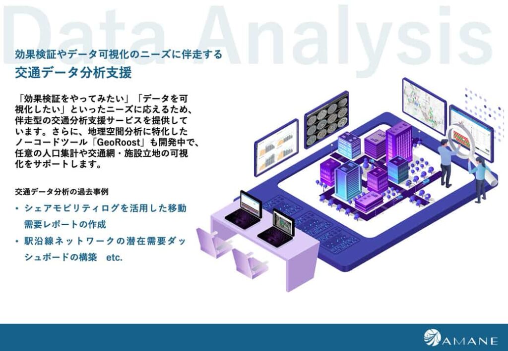 「効果検証をやってみたい」「データを可視化したい」といったニーズに応えるため、伴走型の交通分析支援サービスを提供している。