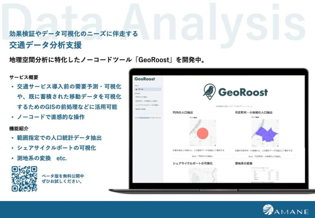 過去事例では、シェアモビリティログを活用した移動需要レポートの作成や、駅沿線ネットワークの潜在需要ダッシュボードの構築などを行ってきた。さらに、地理空間分析に特化したノーコードツール「GeoRoost」も開発中で、任意の人口集計や交通網・施設立地の可視化をサポートする。