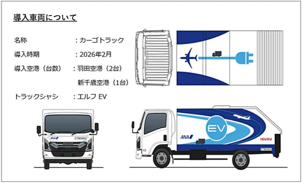 なお同パートナーシップの一環として、2月18日より、一般財団法人環境優良車普及機構と、東京都からの補助金( 羽田空港での運用車両のうち2台のみを都の補助金で対策する )を活用した、いすゞのBEVトラック「エルフEV」のカーゴトラック( トラック運行時の走行動力に加え、荷台上のリフトを動かすための動力も車載バッテリーを利用する車両 )を導入する。