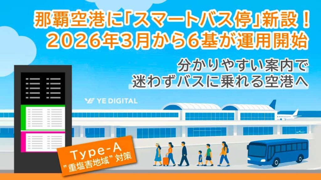 」が那覇空港ビルディング(NABCO /本社 沖縄県那覇市、代表取締役社長:照屋義実)が導入。3月1日から那覇空港旅客ターミナルビル1階バス乗り場の1番~6番へ運用される。 続きを読む YEデジタル、那覇空港に「スマートバス停」6基を導入