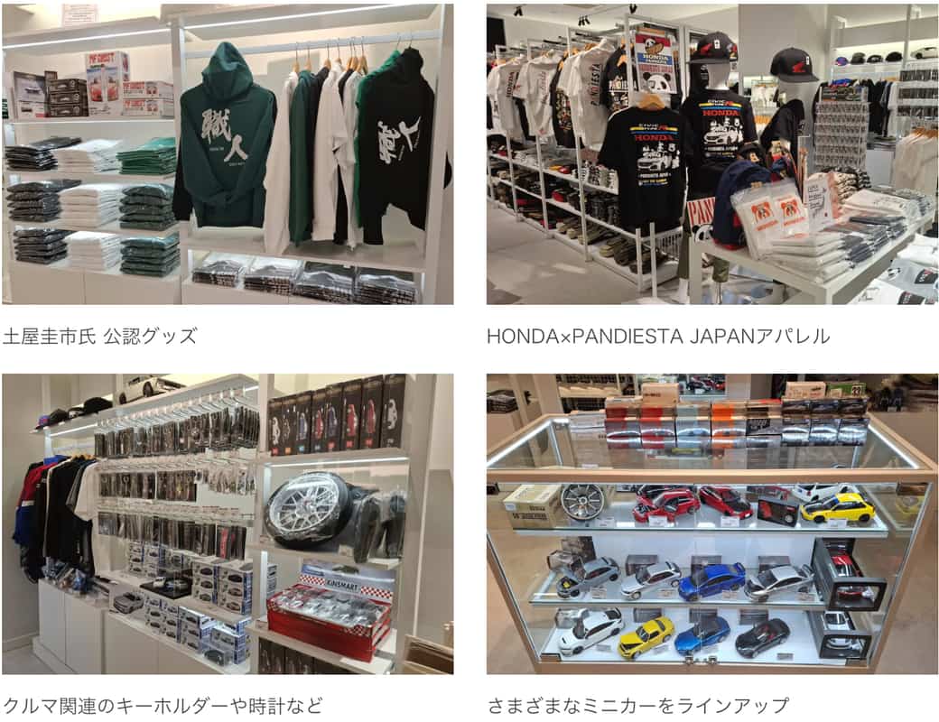 店内では、“ドリフトキング”こと土屋圭市氏のアパレルコレクションをはじめ、CIVICやRX-7などのCARデザインTシャツや、ユニークなHONDA×PANDIESTA JAPANアパレルなどを取りそろえている。