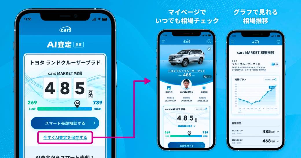 なおAI査定した結果は、cars MEMBERのマイページに保存する機能を搭載。一度保存すれば、リアルタイムのマイカー相場変動をグラフで時系列表示することができる。