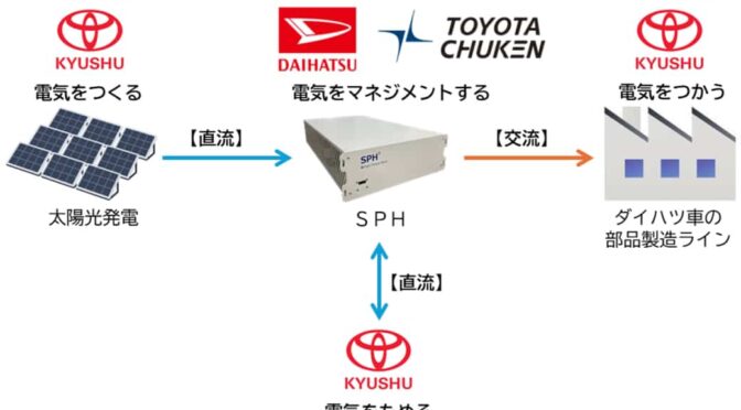 そこで今回の実証実験では、トヨタ九州・小倉工場で、豊田中研とダイハツが共同開発したSPHを活用し、太陽光発電で作られた電気を部品製造ラインに供給する。