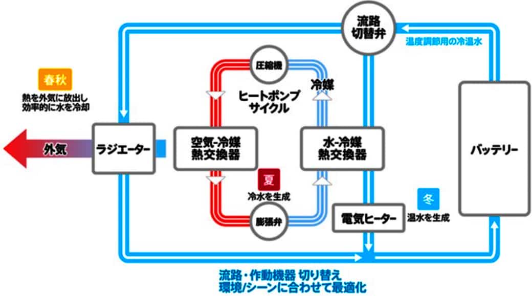 ヒートポンプサイクル(冷媒を用いて熱を移動させる仕組み)、ラジエーター(熱を外気に放出して温調水を冷却する装置)、ヒーター、ポンプなどバッテリーの温度制御に必要な機能を、空調システムと切り離してモジュール化。これにより、車室内空調に影響を与えることなく、バッテリーに最適な温度制御(夏は冷却、冬は加温)を実現した。