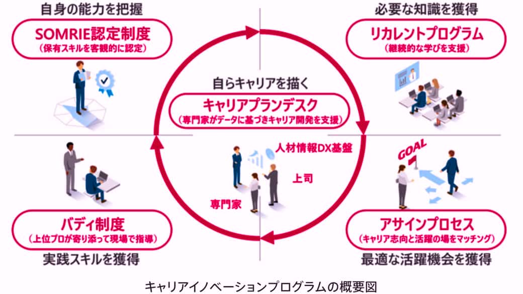 更に(3)は、最適な活躍機会を獲得する「アサインプログラム」、加えて(4)は、プロの下で実践スキルを獲得する「バディ制度」という4つの仕組みで形成され、この4つがキャリア形成に向けた支援を受けられる大枠の「キャリアプランデスク」で纏められた人財育成制度となっている。