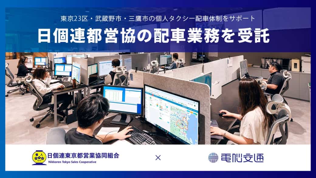 タクシー配車に特化した一連の窓口事業担う電脳交通( 本社:徳島県徳島市、代表取締役社長:近藤 洋祐 )は11月7日、日個連東京都営業協同組合( 都営協 / 本部:東京都豊島区、理事長:三嶋英治 )の配車業務の一部を受託し、同関連業務を2025年11月1日から開始したことを明らかにした。