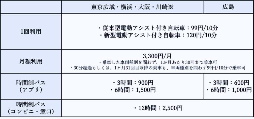 *川崎エリアは5/1時点で新型電動アシスト付き自転車未導入のため、従来型電動アシスト付き自転車の料金に対応