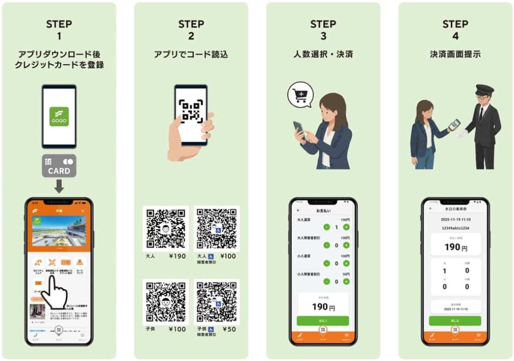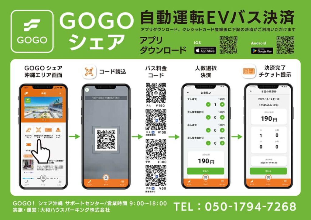 自動運転EVバス利用者は、「沖縄GOGO!シェア」アプリをダウンロードし、クレジットカード登録の上、キャッシュレスコードを読み込んで決済することができる。