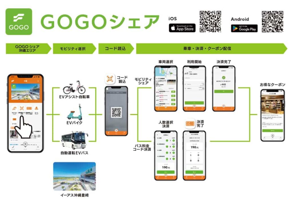 これにより、1つのアプリでEVアシスト自転車、EVバイクに加え、自動運転EVバスをシームレスに利用することができ「イーアス沖縄豊崎」をモビリティハブとする複数事業者間の交通連携を実現し、地域公共交通の課題解決を目指す。