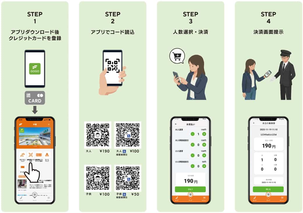 利用方法:「GOGO!シェア」アプリで事前にチケットを購入、または乗車時にバス車内のコードをアプリで読み込む