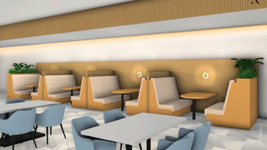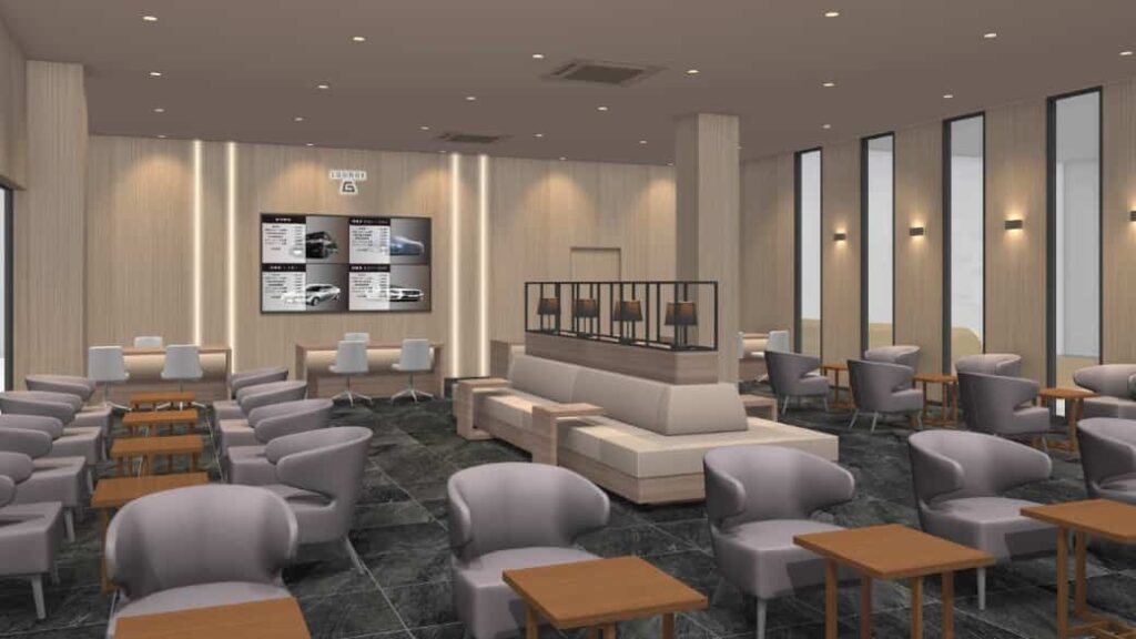 ラウンジスペースは、来店時にゆったりと過ごして貰えるよう、空港のラウンジのような落ち着いた雰囲気を持たせ、高級感のあるデザインに仕上げた。またカフェは様々な種類の飲み物を提供できるようにし、それらは商談スペースやラウンジスペースへ自由に持ち込めるようにしている。