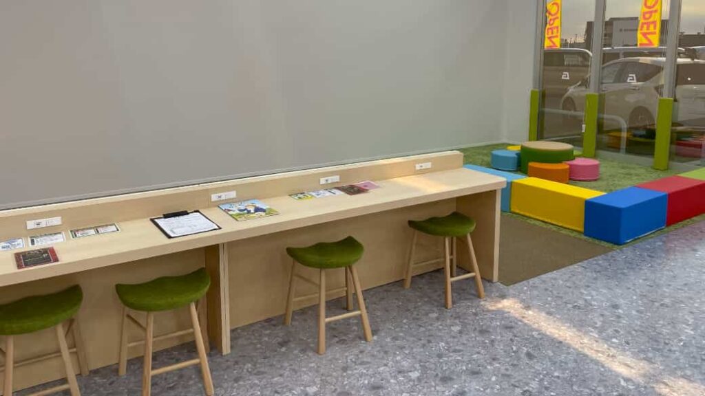小さな子供連れの顧客を筆頭に、誰もが安心して利用・寛げるよう、絵本やおもちゃ等も用意したキッズスペースを設けだ。主にコンセント付きのカウンター席として、子供を見守りつつ商談できる空間を目指した。