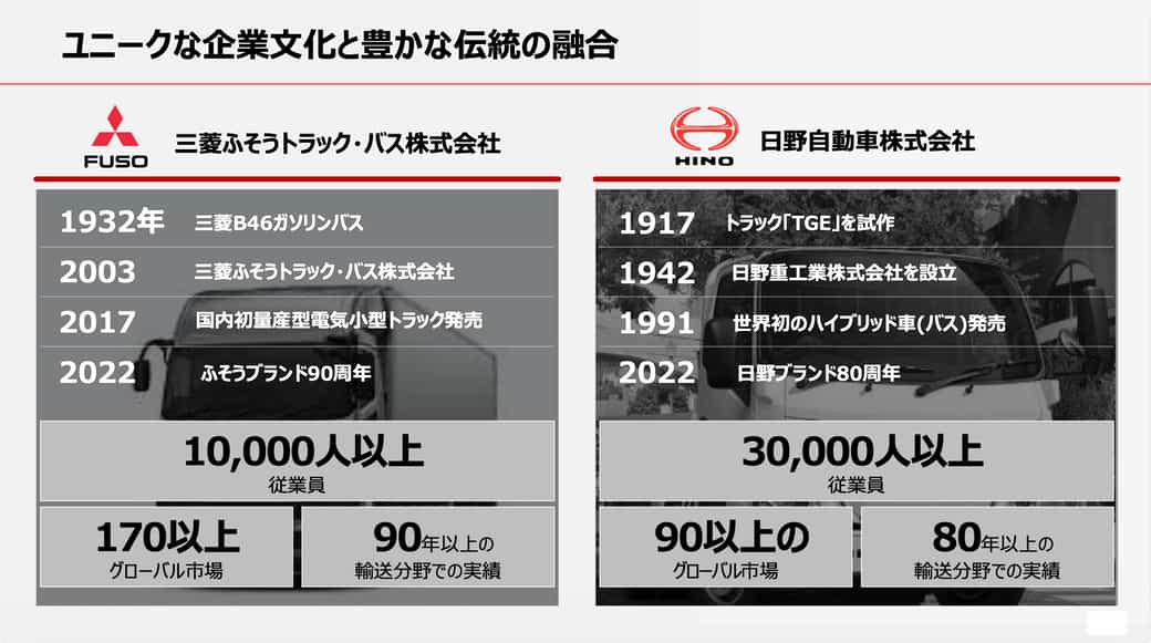 加えて、日野とふそうの両ブランドの車両をお互いに活用することで、より充実した製品ポートフォリオを市場に向けて提供していく。