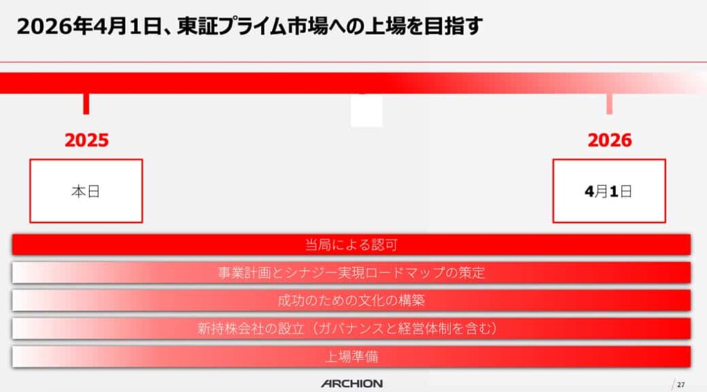 上記の新持株会社「ARCHION」は、英語で弓型の構造物を意味する「ARCH」と、遠い過去から未来まで続く様子を意味する英語の「EON(ION)」を融合させた造語。