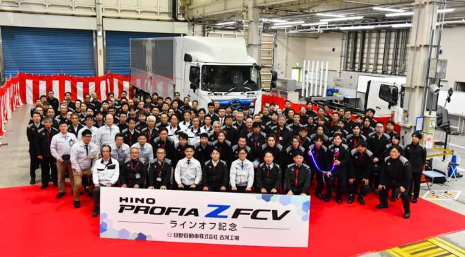 日野自動車(本社:東京都日野市、社長:小木曽聡)は11月13日、古河工場(茨城県古河市)で燃料電池大型トラック「日野プロフィア Z FCV」の量産第1号車のラインオフ式を実施した。