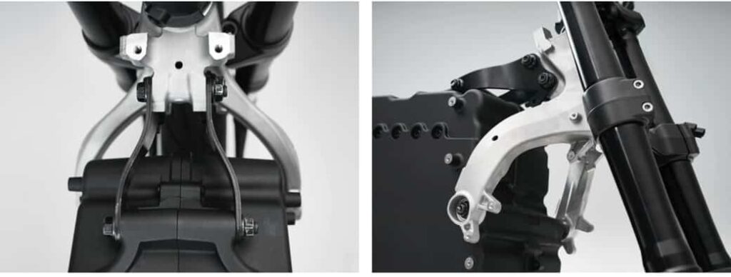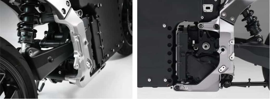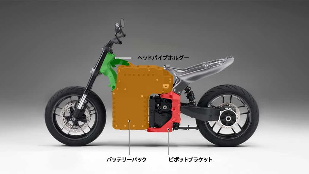 一般的に二輪車の場合、車体骨格には車体の前後を繋ぐフレームが採用されるが、WN7は車体の中心に配置したアルミ製バッテリーケースを骨格の一部とする構造を採用した。