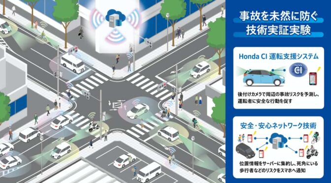 より具体的には、カメラなどの車載技術で周辺環境の認知・予測を行うCIと、交通参加者同士が繫がるコネクテッド技術「安全・安心ネットワーク」とを組み合わせることで、より複雑な条件下での交通事故の未然防止を目指す。
