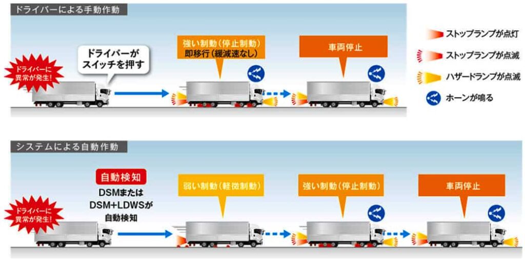 ドライバーの状態をモニタリングするドライバーステータスモニター(DSM)のカメラが異常を検知した場合、もしくはドライバー自身によるEDSSスイッチの操作があった場合にブレーキ制御を自動で開始、徐々に速度を落として停止する。