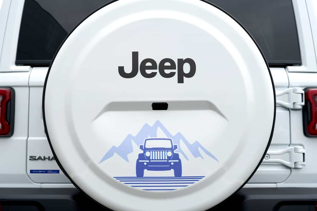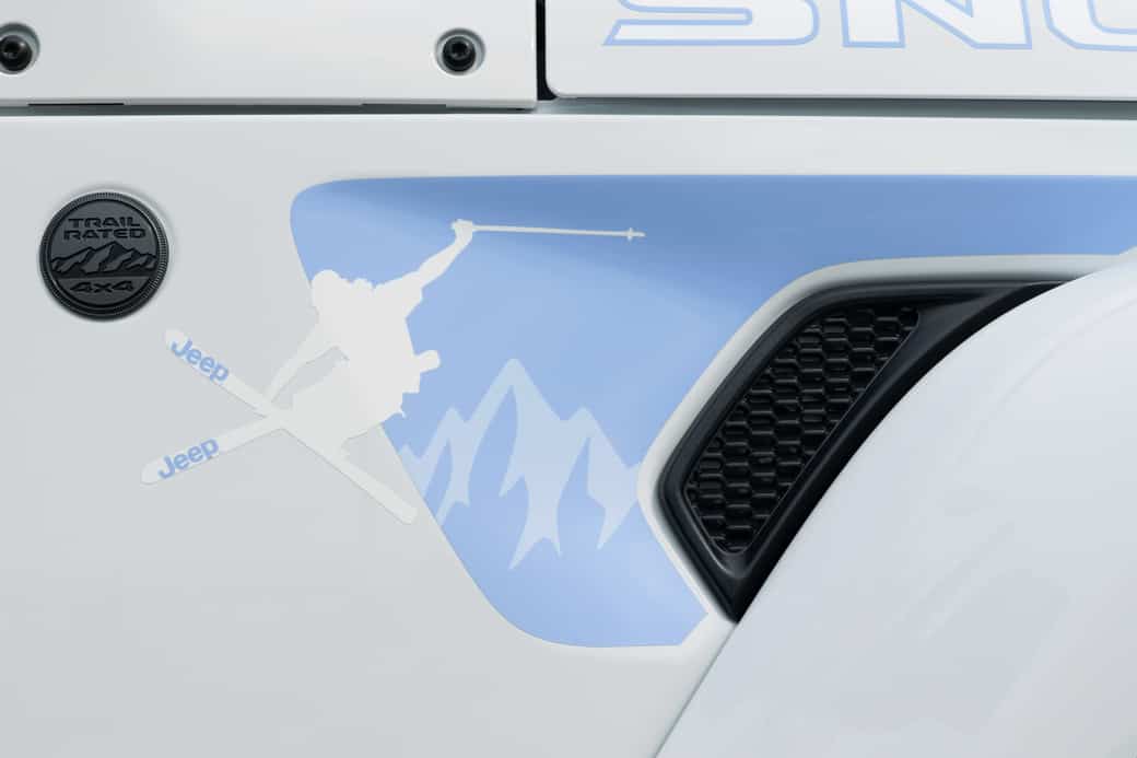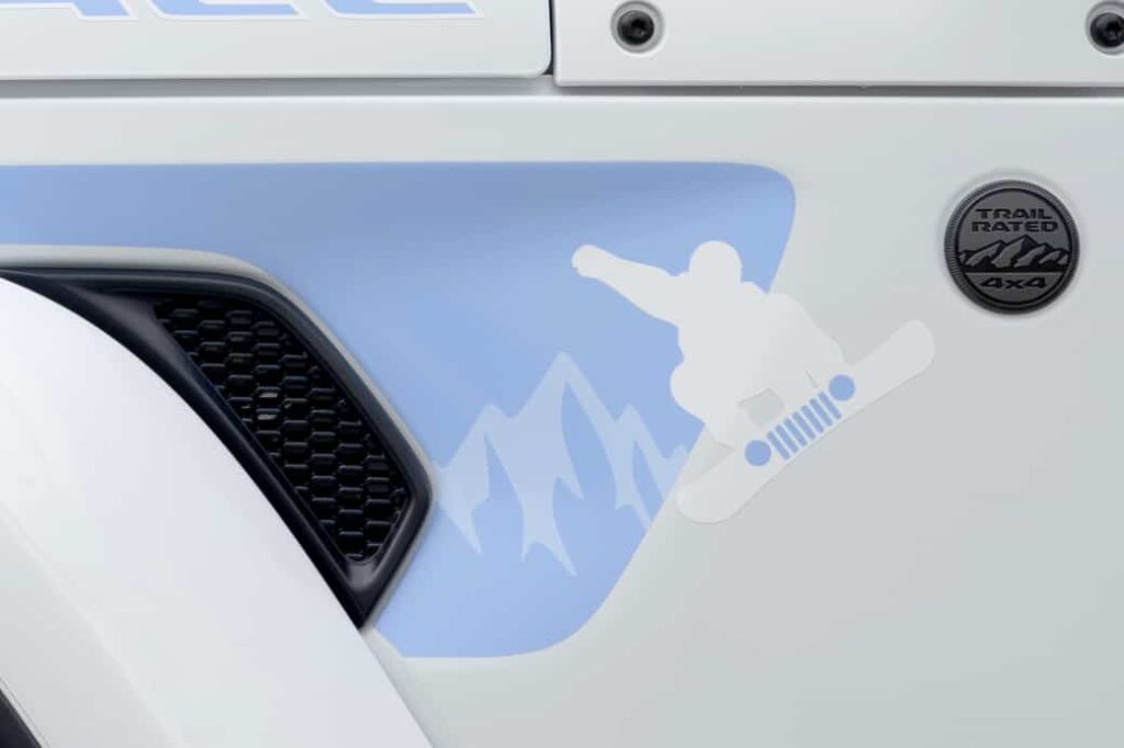 また、車両の背面には、Wranglerのイラストをプリントしたホワイトのハードタイプスペアタイヤカバーを装備し、Jeep® ロゴ入りのホワイトドアミラーキャップとあわせて、白銀の世界をイメージした一体感のある仕上がりとなっている。
