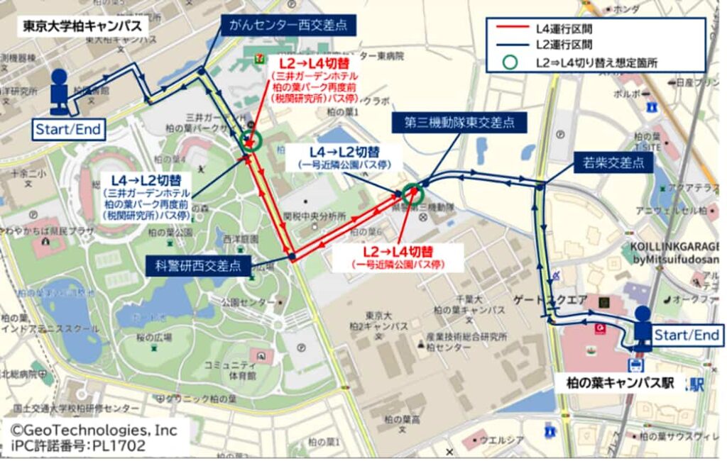 *一号近隣公園停留所から三井ガーデンホテル柏の葉パークサイド前(税関研修所)停留所までが特定自動運行区間となる。