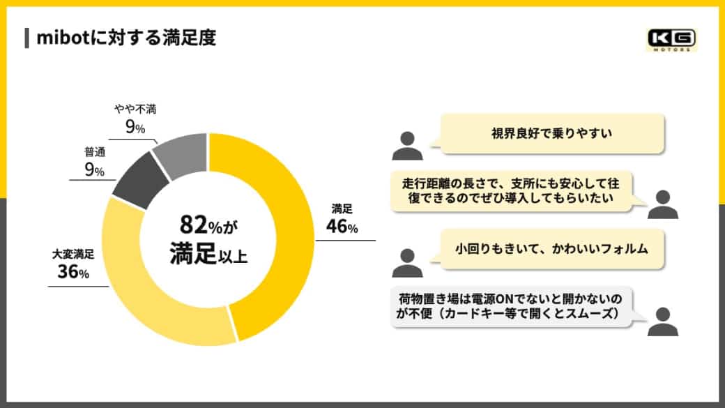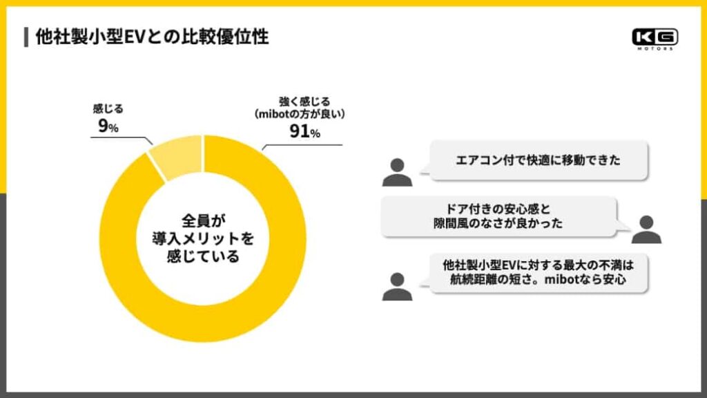既存の他社製小型EVと比較した場合、回答者の91%がmibotの優位性を「強く感じる」と回答した。特に、エアコンによる快適性やドア付き構造による安心感、航続距離への安心感が評価要素として挙げられている。
