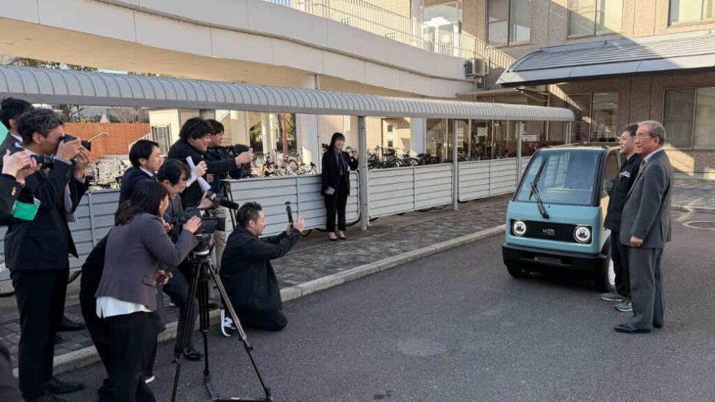 東広島市とKGモーターズの協定締結式後、mibot前で報道陣の取材に応じる様子
