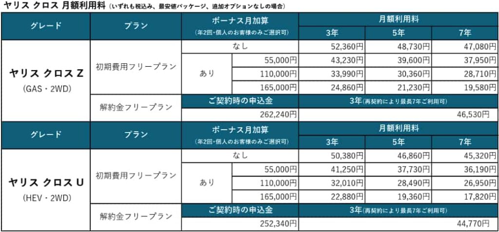 ヤリス クロス(2026年2月一部改良モデル)KINTO 月額利用料