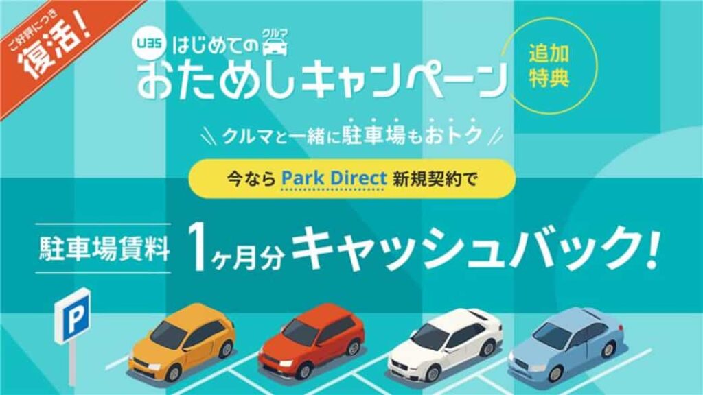 「【U35】 はじめてのクルマ おためしキャンペーン」を利用中、またはこれから利用する対象者が、期間中に「Park Direct」で駐車場を新規契約すると、駐車場月額賃料1カ月分をキャッシュバックされる。