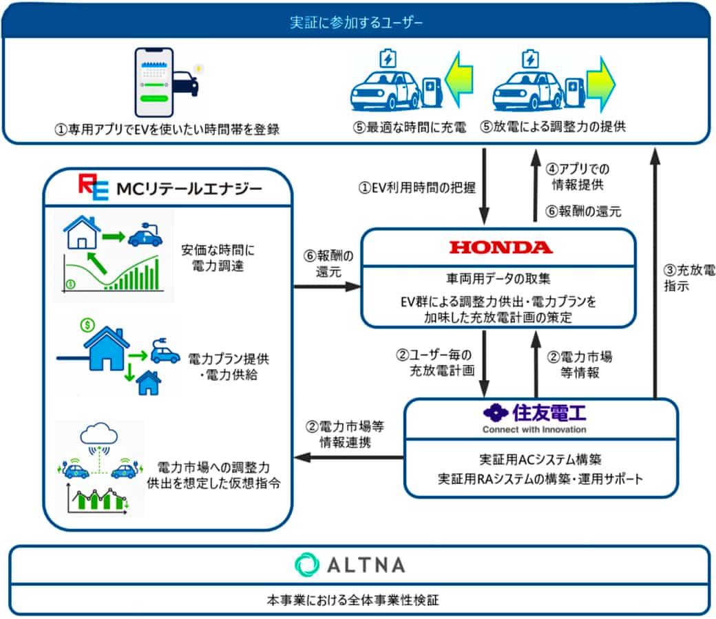 MCリテールエナジー、住友電気工業、本田技研工業、ALTNAソリューションズの4社は、MCリテールエナジーが東京都から令和6年度に採択された「GX関連産業創出へ向けた早期社会実装化支援事業」の一環として、個人が所有するEVに蓄えた電気を、家庭や地域の電力ネットワークへ供給するVehicle to Grid(V2G)の実証を今年12月に開始した。