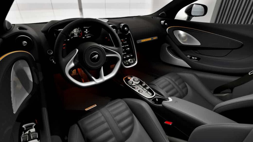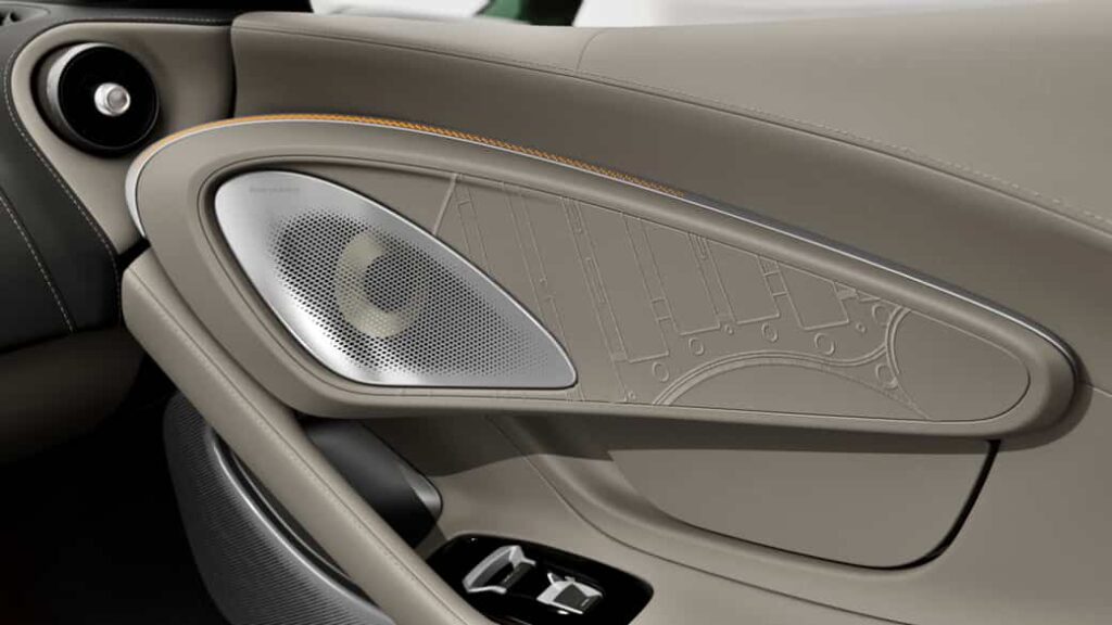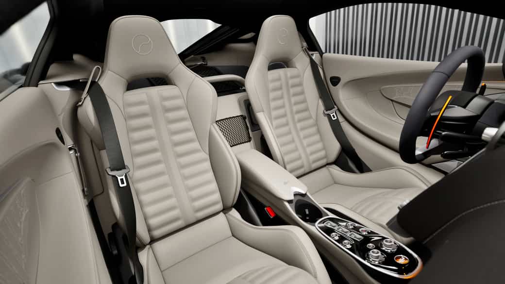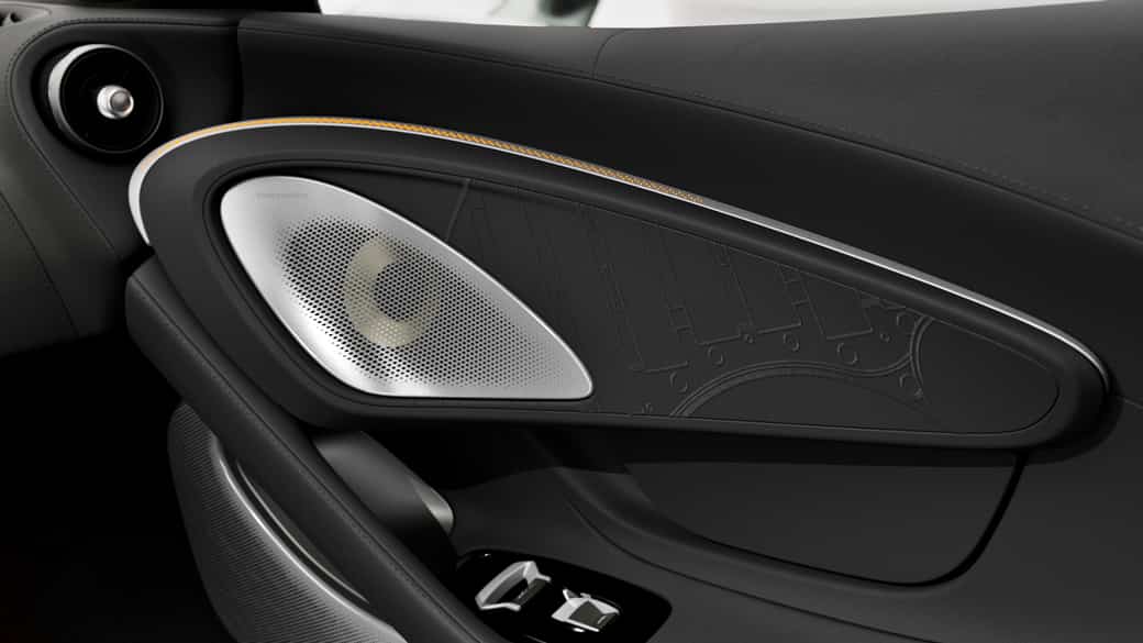 ドア内張のフェイシアプレートに目を向けると、MTCの設計図面から俯瞰図の一部を切り取ってデザイン化したものが、同系色のトーナルスティッチとして縫い込まれるなど、まさに細やかなディテールに至るまでマクラーレンの“ホーム”を感じさせる仕上がりとなった。