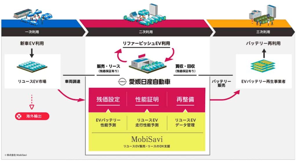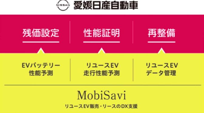 MobiSavi(モビサビ/本社:神奈川県横浜市、代表取締役社長:左向 貴代)と、愛媛日産自動車(本社:愛媛県松山市、代表取締役社長:岡 豊)は、EVの「性能証明」と「残価保証」などを組み合わせた国内初となるリユースEV「ReNew EV」の提供を開始した。