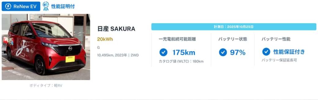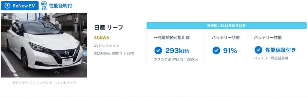 車両概要を、より具体的に説明すると今回、両社が提案しているReNew EV(リニューEV)とは、「性能証明」、「残価保証」、「バッテリー性能保証」、「再整備」を備えることで、リユースEVに対する品質面の不安を軽減し、安心して選べる高品質なリユースEVとしているもの。