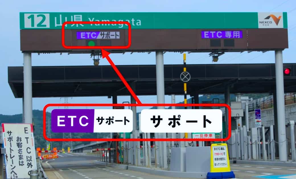ETCが利用できない状態(ETC車載器未設置、ETCカード未挿入など)でETC専用料金所を利用した場合は後退せずに、『ETC/サポート』または『サポート』と表示されたレーンを通行し、一旦停止して係員などの指示に従う格好になる。