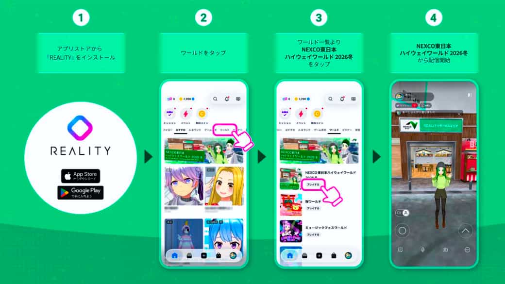 NEXCO東日本(東日本高速道路/本社:東京都千代田区、代表取締役社長:由木文彦)とグリーエックス(GREE X, Inc./本社:東京都港区、代表取締役社長:は足立和久)は、スマートフォン向けメタバース「REALITY」アプリ上で、メタバース上で高速道路空間を再現した「NEXCO東日本ハイウェイワールド2026冬」を2月4日(水)~3月4日(水)までの1か月間、期間限定でオープンする。