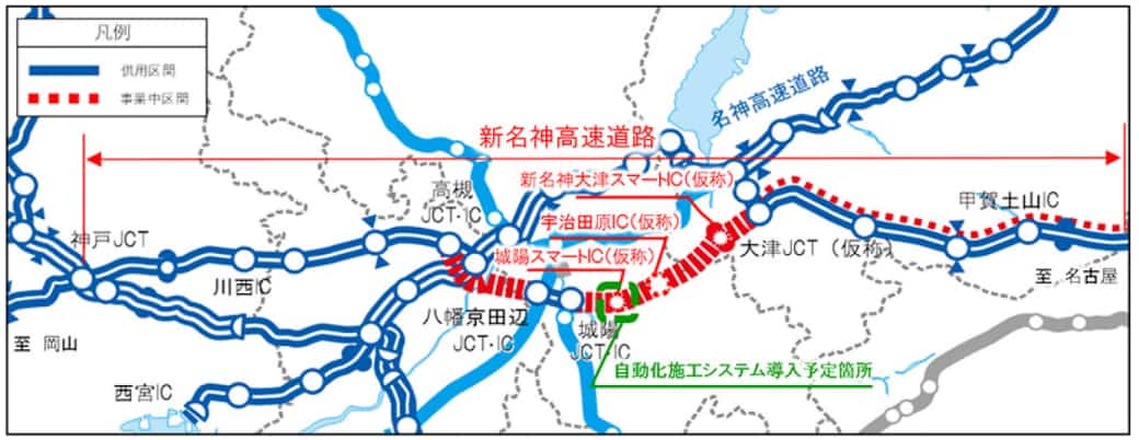 NEXCO西日本(本社:大阪市北区、代表取締役社長:芝村 善治)と鹿島(本社:東京都港区、代表取締役会長兼社長:押味 至一)は2月4日、E1A新名神高速道路(大津JCT(仮称)~城陽JCT・IC間)京都府城陽市の建設現場に於いて、工事の施工を担当する、鹿島が開発した建設機械の自動化施工システムA⁴CSEL®(クワッドアクセル)を導入し、自動ブルドーザと自動振動ローラによる施工を本格的に開始した。