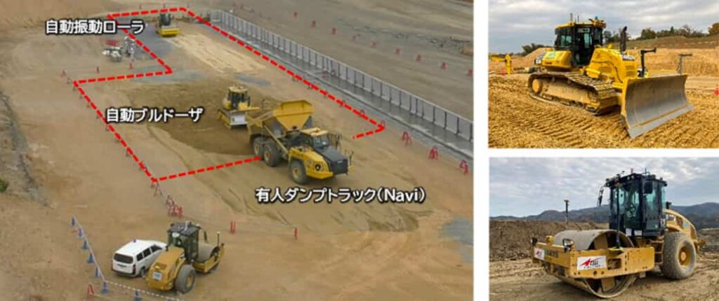 *冒頭写真は、A⁴CSEL自動ブルドーザと自動振動ローラによる盛土作業の自動化施工状況