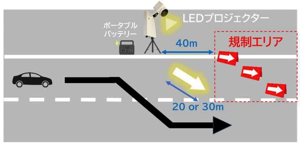 2025年2月、首都高が管理する敷地内で規制エリアを再現し、路面投映技術の視認性を検証した。対象とした映像投映機器は、高速道路規制の現場で実際に使用されている複数の既存製品と日本精機の開発品であるLEDプロジェクターとなる。