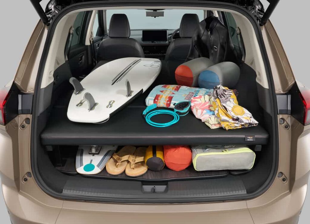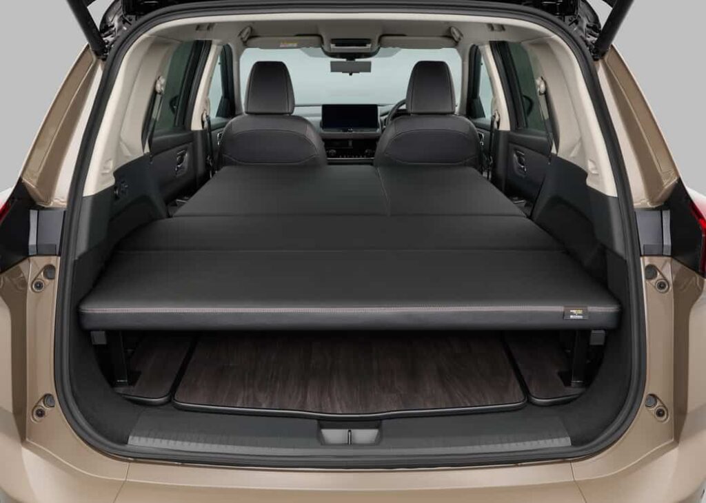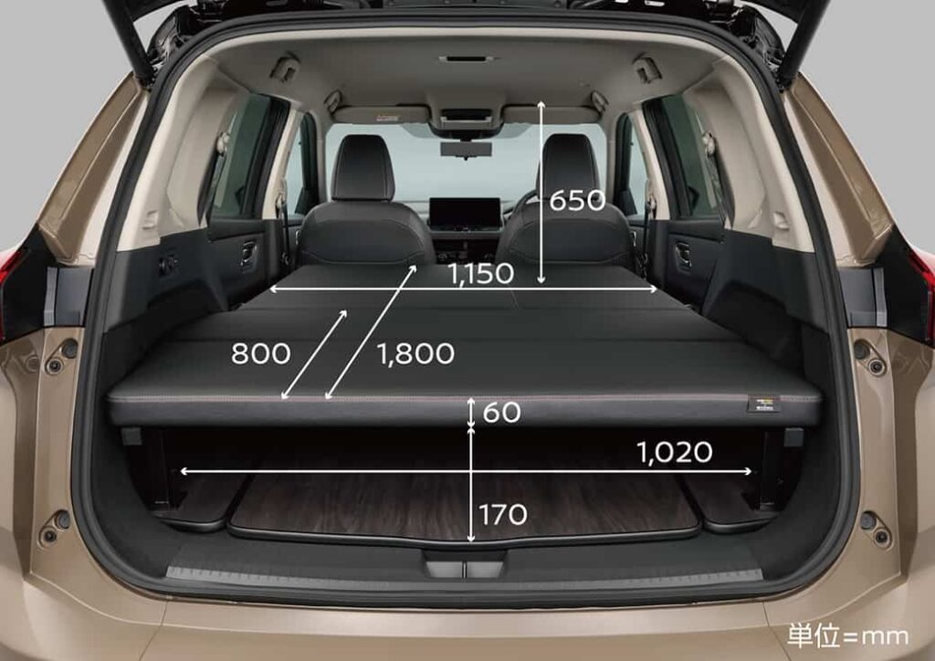 ベッド展開時にはベッド下に荷物を収納することもでき、車内での快適な休憩や宿泊のための機能を有しながら、積載性も兼ね備えている。