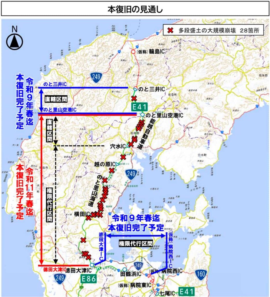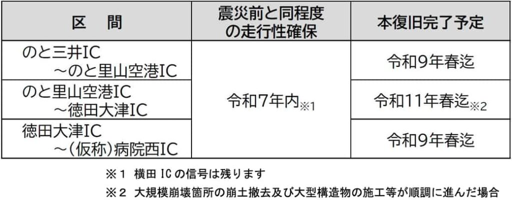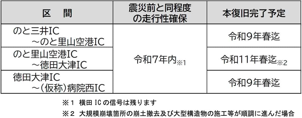 また、能越自動車道等の、のと三井(みい)IC~のと里山(さとやま)空港IC、徳田大津(とくだおおつ)IC~(仮称)病院西(びょういんにし)ICについては、令和9年春迄の本復旧完了を予定している。