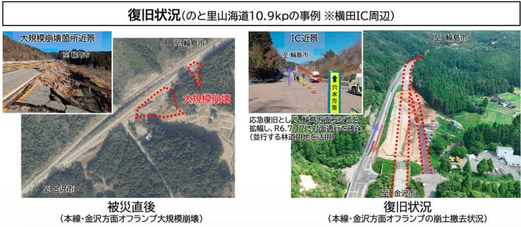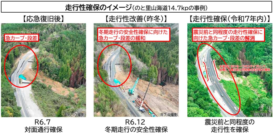 国土交通省は12月12日、先の令和6年能登半島地震の発生の影響で、多段盛土の大規模崩壊28箇所を含めた、大きな被害が発生した能越自動車道等について、令和7年内に震災前と同程度の走行性を確保(急カーブ・段差の解消)するべく、順次復旧工事を重ねていることを示した。