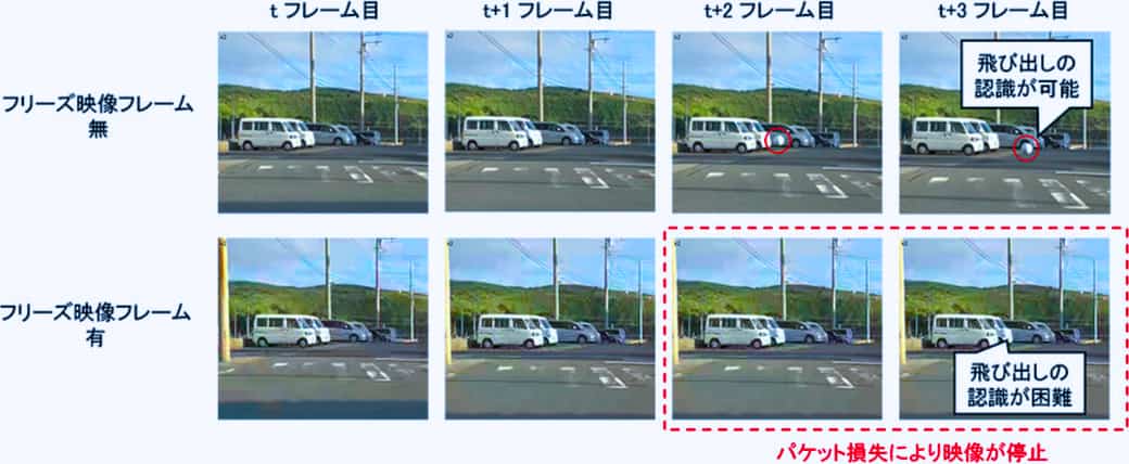 ビットレート低下によって画質低下が発生すると、遠隔監視者が自動運転車両の前方への物体の飛び出しを認識しづらくなる(図1)。また、パケット損失が発生すると、映像フレームが停止(フリーズ)するため、物体の飛び出しも認識しづらくなる(図2)。