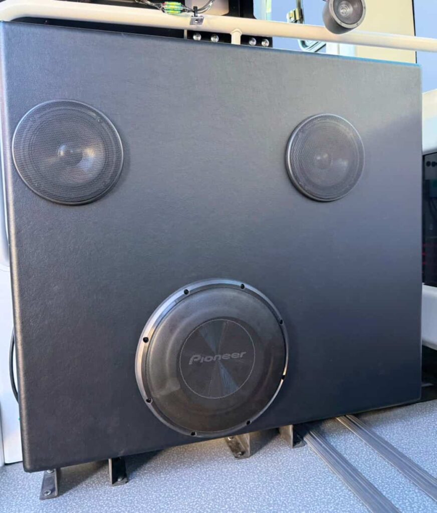 *写真は、パイオニア スペシャルサウンドシステムを搭載した「Communication Palette」の車内(上)と、専用スピーカー(下)