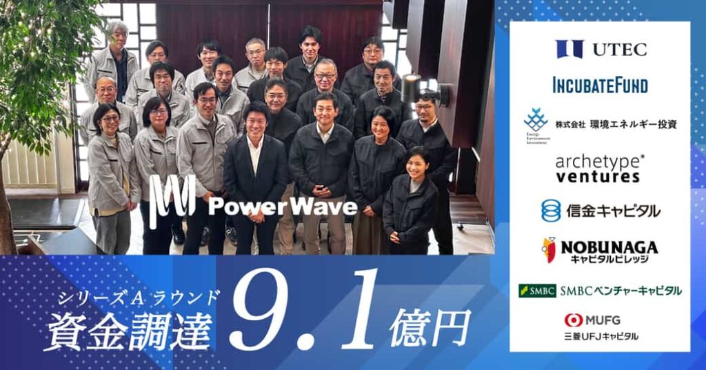 パワーウェーブ( 本社:愛知県豊橋市、代表取締役CEO:種田憲人 )は、Series Aラウンドとして複数のベンチャーキャピタルを引受先とした第三者割当増資により、総額9.1億円の資金調達を実施した。