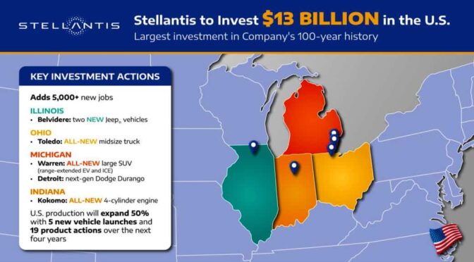 この投資は、同社事業の米国における長年の歴史の中で最大規模のものであり、同社の有する複数のブランドで5車種の新型車の製造実施を見込むほか、新型4気筒エンジンの生産、そしてイリノイ州・オハイオ州・ミシガン州・インディアナ州の工場において計5,000人以上の新規雇用を創出する予定。