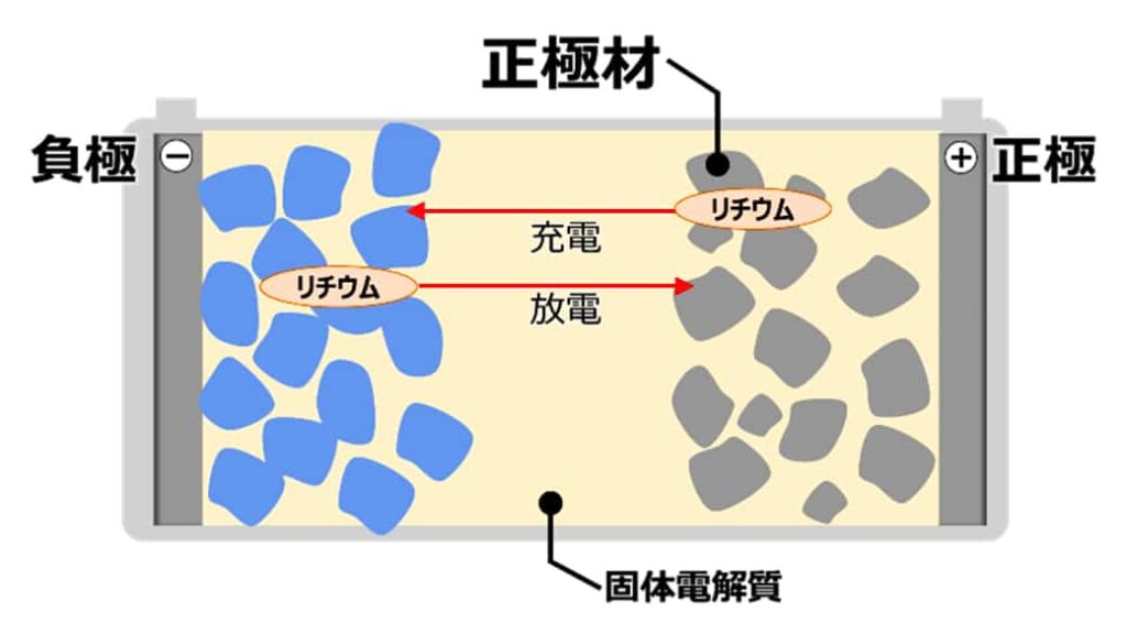 上記の全固体電池とは、正極・負極・固体電解質を主な構成素材とし、現在主流の電解液を使用した液系電池と比べて、小型化・高出力・長寿命のポテンシャルを持つ次世代の電池を指す。